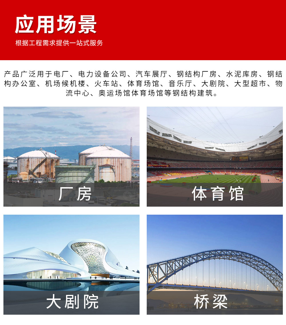 本產品具有自重輕、強度高、鋼度大、防腐性好、抗震性強、耐火性佳、施工便捷、易于更新,同時符合國家倡導的節能、環保、安全要求。